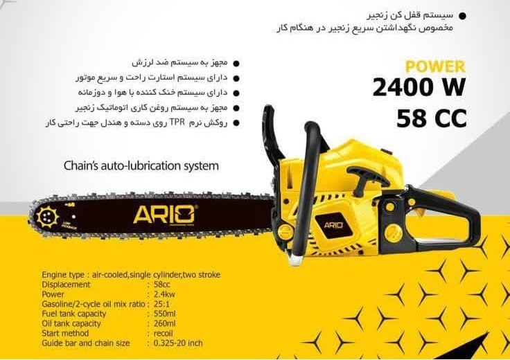 مشخصات فنی اره زنجیری بنزینی 50 سانت آریو